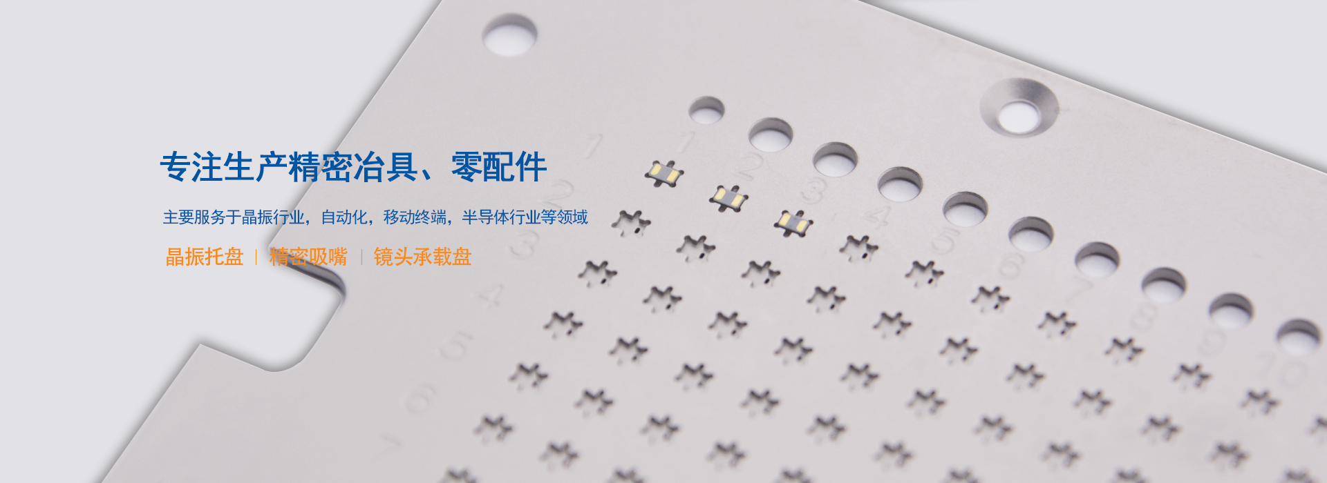 無錫吉微精密電子有限公司專業生產精密冶具、零配件等以及從事精密冶具配套設備生產的高新技術企業,公司自2013成立以來,建立國際標準化管理體系,2018年曾通過ISO9001:2015質量體系認證。同時獲得“國家科技型中小企業”榮譽證書,包括專利證書已經50+。主要供應:晶振托盤、精密吸嘴、鏡頭承載盤等。